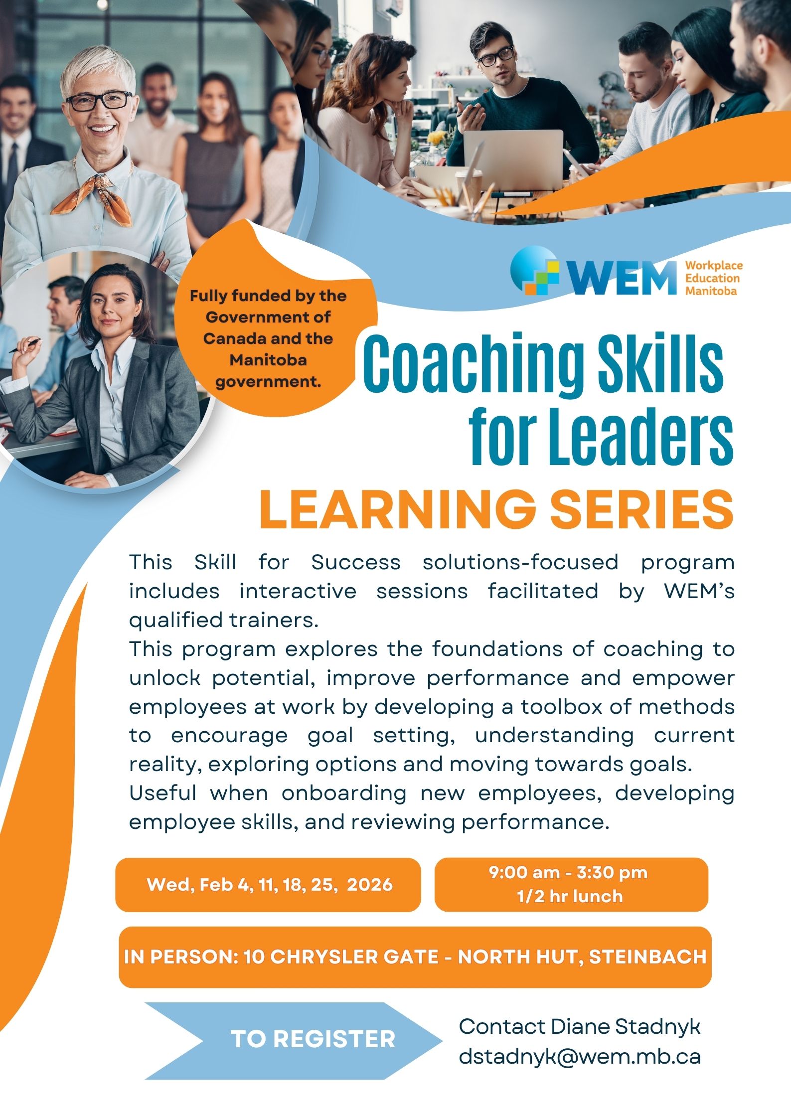 Coaching Skills for Leaders Learning Series + Add to Google Calendar + iCal / Outlook export 00 days 00 hours 00 minutes 00 seconds Search for: Recent Posts Government of Canada partners with Workplace Education Manitoba to design and deliver skills training to support Canadian workplaces Recent CommentsDarlene Redekop on Personal Management Basics WorkshopsJasmine Ferriss on Personal Management Basics WorkshopsChyna Fehr on Personal Management Basics WorkshopsArchives March 2022 Categories Media Release Meta Log in Entries feed Comments feed WordPress.org