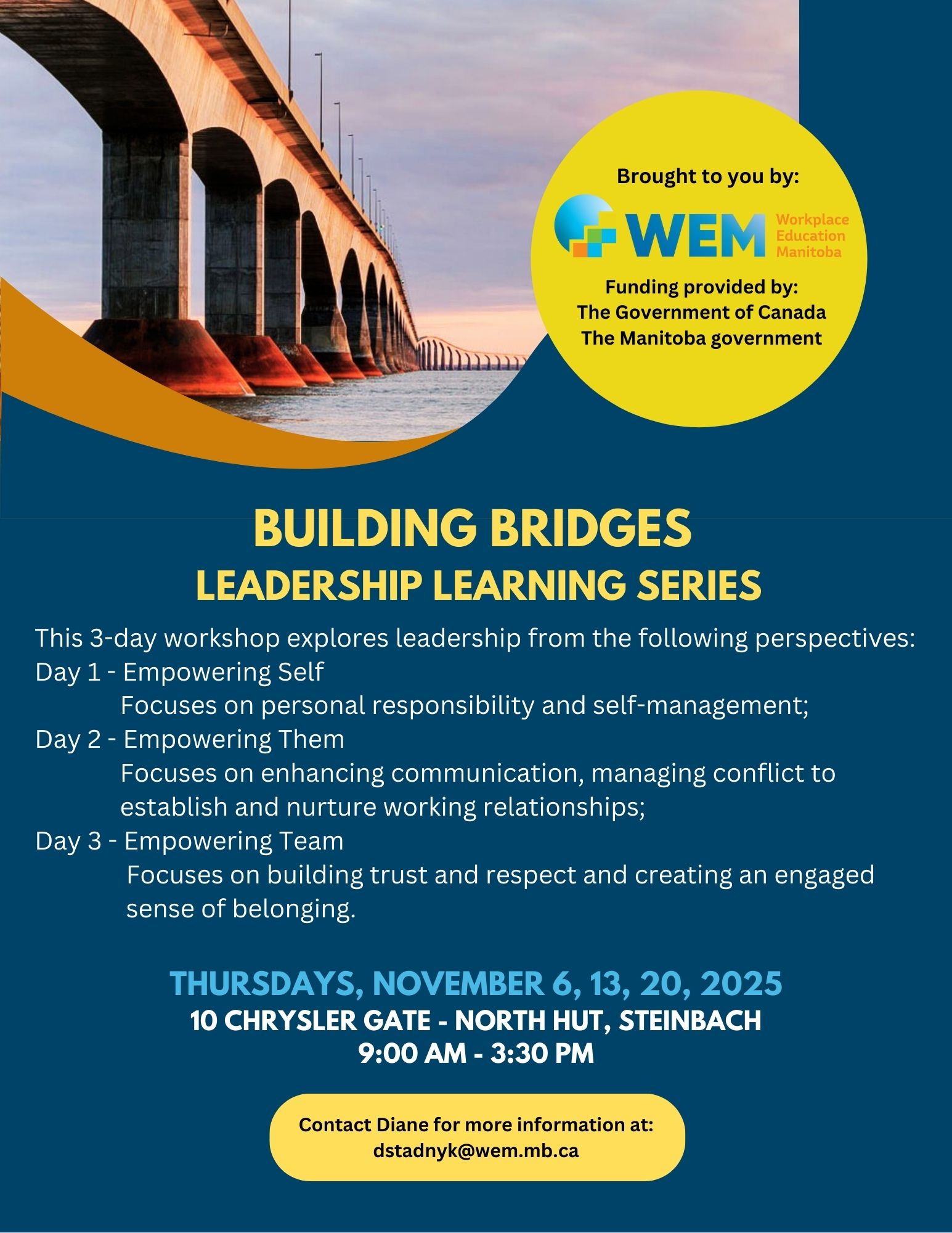 Building Bridges – Leadership Learning Series + Add to Google Calendar + iCal / Outlook export 00 days 00 hours 00 minutes 00 seconds Search for: Recent Posts Government of Canada partners with Workplace Education Manitoba to design and deliver skills training to support Canadian workplaces Recent CommentsDarlene Redekop on Personal Management Basics WorkshopsJasmine Ferriss on Personal Management Basics WorkshopsChyna Fehr on Personal Management Basics WorkshopsArchives March 2022 Categories Media Release Meta Log in Entries feed Comments feed WordPress.org